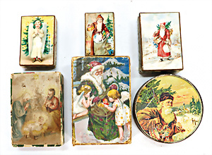 5 Teile, Pappdosen mit Weihnachtsmotiv, 4-7,5 cm, eventuell für kl. Weihnachts-Laden, 1 Blechdose