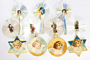 6 Teile Christbaumschmuck, Papier, lithogr., Kreise u. Sterne, D: 11 cm, 1 Tüte silber Engelshaar, 3 Tüten Schaumsilber u. Christbaumgold