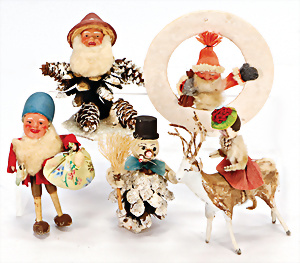 Weihnachtsschmuck, Zapfenzwerg mit Pilz-Hut, Zapfen-Schneemann, Weihnachtsmann im Kreis, Glimmer, Zwerg mit Sack, 1 Rentier mit Watte-Figur, 7-10 cm
