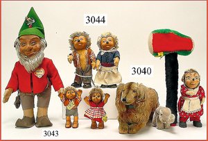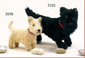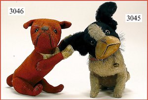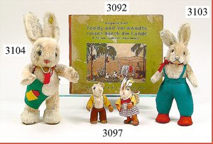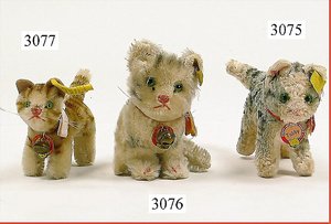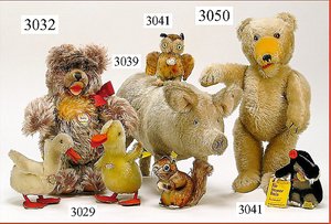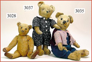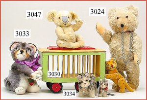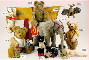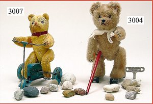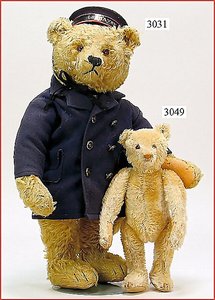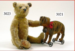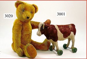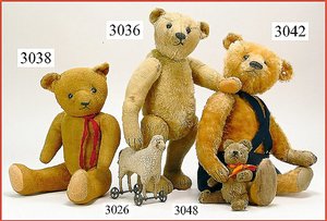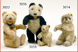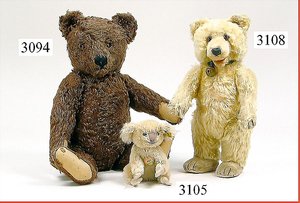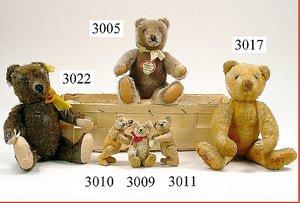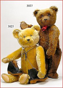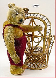 STEIFF Bär, 26 cm, Buckel, lange abgeknickte Arme, mit Knopf, Schriftzug langgezogenes F, helle Bestickung, einige Stellen weiß, einige Stellen gelb, die helle Bestickung läßt auf einen weißen Bären in teilw. vergilbtem Zust. schließen, Mohair bis auf kl. Stellen guter Zust., sehr schöner Ausdruck, Filz in sehr gutem Zust.