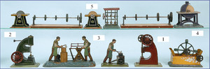 2 Teile BING, Antriebsmodell, Mann am Amboss, sowie zwei Mann an der Säge, 13,5 cm, Blech, lithogr. Sockel am Rand, kleine Stelle herausgetrennt, sonst gut
