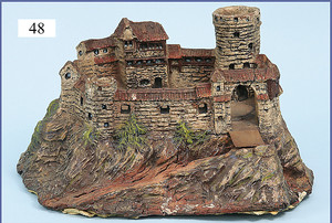 ELASTOLIN kl. Burg, Masse, 34 cm breit, Zugbrücke, mit Flugrost, altersbedingte Rissbildung, bespielt, Sockel, von unten her teilw. ausgebessert