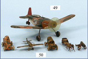 Elektoy, 2-motoriges Flugzeug, D-10EE, bespielt, ein wenig Flugrost, dazu kl. Tank, 7cm, hintere Verkleidung fehlt, 1 Traktor ohne Figur, kl. Kanone, etwas verbogen, 1 Gespann, ohne Figuren