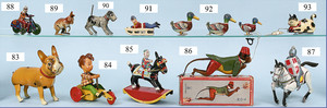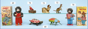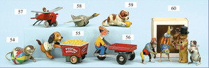 KÖHLER Zirkus-Set, spielender Bär, Clown auf Händen laufend, Affe mit Ball, Hund mit Stock, Blech lithogr., neuwertig, im Orig.-Kart., absolut selten