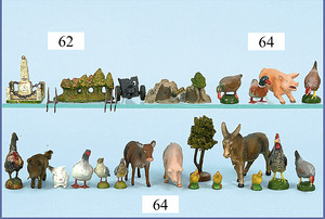 Konv., 19 Teile Bauernhoftiere, Masse, Elastolin und andere, sehr guter Zust., dazu 1 Wildschwein, Masse, geflockt, 1 Baum, sehr guter Zust.