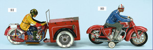 J.M.L. Frankreich, Motorrad mit Lastenwagen, Blech lithogr., ca. 1936, 36 cm, Uhrwerkantrieb intakt, Lackschäden am Wagen, Motorrad u. Fahrer in sehr gutem Zust., selten Quellennachweis, Moto Giocottdo Danilo Lalasia Seite 26, selten