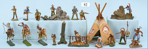 ELASTOLIN schönes Konv., Cowboy -u. Indianerfiguren, Masse, 2 Indianer zu Pferd, 6 Indianer kämpfend u. Lagerleben, 1 Kind Krug tragend, selten, 1 Cowboy zu Pferd, Marterpfahl, 7 Cowboys kämpfend, Lagerfeuer mit Spieß, Geländeteile, meist Zust. 2
