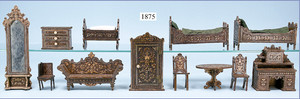 außergew. frühes Puppenstuben-Möbelprogramm, Verzierungen sind handgeschnitzt, sehr filigrane künstlerische Arbeit ( wie ich sie selbst noch nie in einer Puppenstuben gesehen habe ), Kleiderschrank, Griff Bein 16 cm, 2 Betten, Wiege, Kommode, Spiegel, 2 Stühle, Eckstuhl, Tisch, Sofa, 1 Fuß am Sofa fehlt, museal, für herrschaftl. Stube o. Puppenhaus