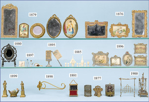 6 Puppenstuben-Bilder, 1 sakrales Bild, Rahmen Messingblech vergoldet, 2 Rahmen Zinn, 2x Papierrahmen, 1 Spiegel, Rahmen Zinn, 7,5 cm hoch (n. a. T. f. )