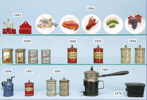 Puppenstuben-Ausschmückungsteile, Zinn, Tassen, Teller, Kaffeekanne, Platten, kl. Glocke, kl. Kalender, 1899, 2 Glasvasen (n. a. T. f. )