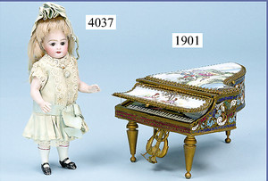 Spieldose, Flügel, Messing-Blech vergoldet, aufwendig emailliert, Bildrisse, mittelalterlicher Musiker über den Tasten auf der Verschlussklappe, sowie auf dem Flügel seitlich Messing-Blech-Verzierungen mit filigranen Emaillearbeiten, 15,5 cm lang, Spielwerk intakt, wunderschön zu einer hochwertigen Mignonnette o. herrschaftl. Puppenstube