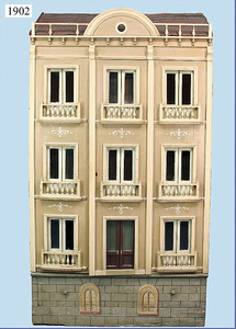 Grands Magazin Du Louvre Paris Comptoir Des Jouets, franz. Puppenhaus, zusammensteckbar, Fassade vorne abnehmbar, Eingangsbereich mit Tür u. Fenstern, Dachfenster im Giebel auflithogr., außen mit aufwendig lithogr. Papier beklebt, innen u. außen in sehr schönem Orig.-Zust., 57 cm hoch, 57 cm breit, 37 cm tief, sehr schöner Orig.-Zust. innen u. außen, Deckbild des Orig.-Kart. innen stark verschlissenem Zust. vorhanden, 1 äußerst deko. Teil, Quellennachweis, Abbildung, gleiches Haus, " Dollhouses The Collector´s Guide " von Valerie Jackson Douet Seite 6