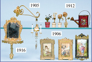 3 Teile Puppenstuben-Zubehör, 2 Spiegel, Rahmen Messing-Blech vergoldet, 8,5 cm u. 10,5 cm breit, 1 Bild mit Zinnrahmen
