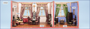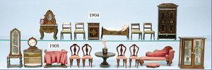 Puppenstuben-Möbelprogramm Gründerzeit, Sofa, 19,5 cm, Büffet Höhe 21 cm, Schreibtisch, Tisch, 2 Stühle, Spiegelkommode