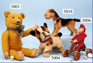 STEIFF Hund, Radler, 9 cm, ausgef. Gr., mit Kopfdrehmechanik, mit Knopf u. Schild, teilw. Mohairverlust, ausdrucksstark