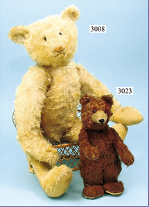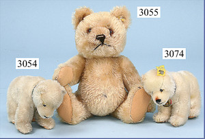 STEIFF Bär, ca. 1925, 36 cm, weiß (etwas eingegilbt ), helle Bestickung, lange abgeknickte Arme, leichter Buckel, mit Knopf, Druckstimme defekt, Tatzen etwas verschmutzt, jedoch in gutem Zust., kl. Stellen Mohairverlust, 1 Stelle unter dem Hals Stoff etwas aufgegangen, schöner Ausdruck