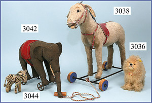 STEIFF Esel, auf Rädern, Mohair, Holzwolle gestopft, Mohair an einigen Stellen ausgegangen, Ledersattel, Höhe 46 cm