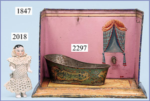 wohl ROCK & GRANER kl. Blech-Badezimmer, 27,5 cm breit, Wasserbehälter, sehr schöne Orig.-Bemalung, aufgemaltes Fenster, stark verschmutzter Dachbodenfund