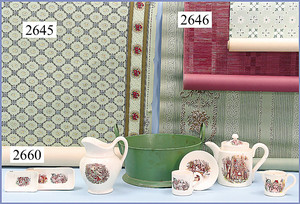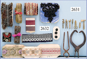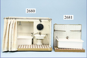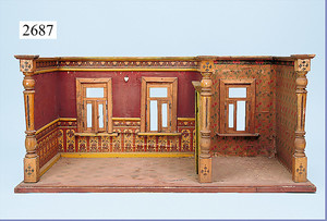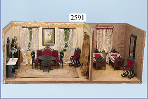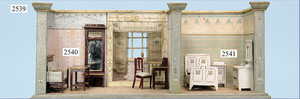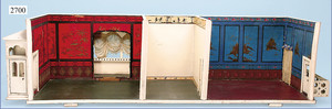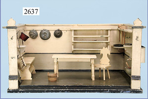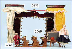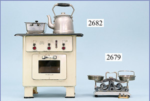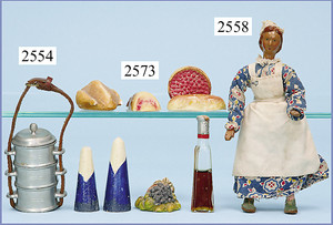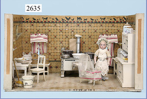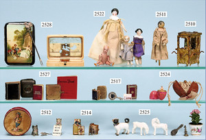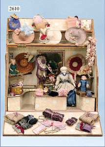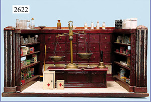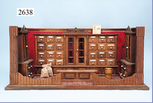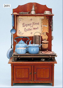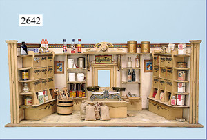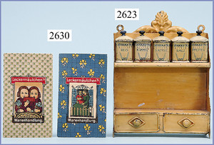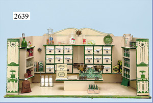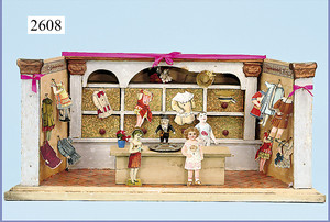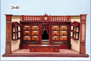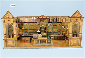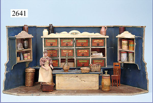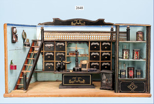 Kaufladen, ca. 1890, 87 cm breit, 43 cm hoch, seitl. Schaufenster, Orig.-Theke, Schubladen mit buntem lithogr. Papier beklebt, Orig.-Tapete an Wand u. Boden, teilw. ausgebessert, mit Zubehör, lithogr. Blechdosen, Holzteile, Flaschenhalter, Waage, Kasse, Weißblech, Verkäuferin, glasierte Biskuit-Porzellan -Arme u. -Beine, Stoffkörper, altes Kleid
