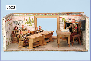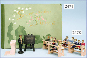 ERZGEBIRGE kl. Schule, Schulbänke, Lehrerpult, Tafel, Kinder Holz geschnitzt, mit angedeuteter Nase, 8 cm, bewegl. Arme u. Beine, sehr schöne Orig.-Bemalung, Lehrer Masse, 11,5 cm