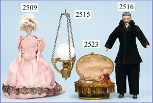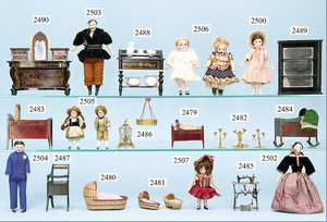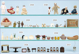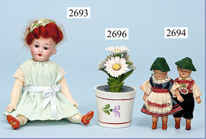 5 Puppenstuben-Puppen, davon 4 Ganzbiskuit, 8,5 cm - 11 cm, meist guter Zust., 1 Puppe Füße bestoßen, Orig.-Kleidung, 1 Biskuit-Kurbelkopf-Puppe, 13,5 cm, Glasaugen, schöne Orig.-Kleidung, 1 Fuß weggebrochen, Fehler an 1 Arm