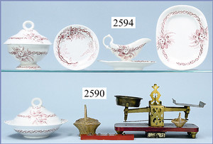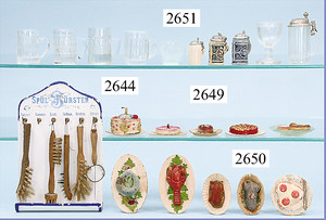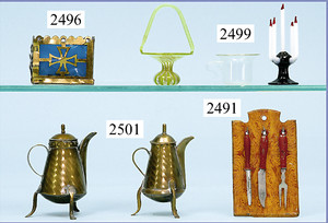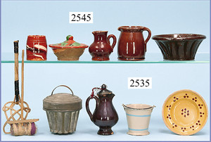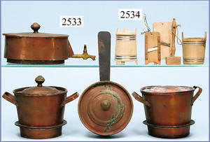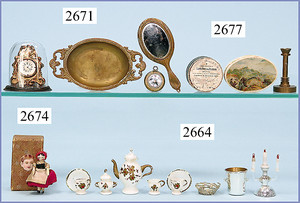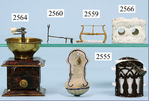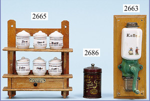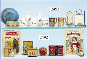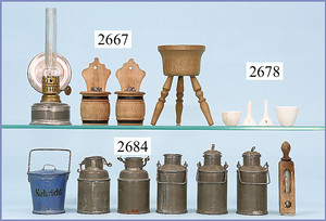Konv. Puppenküchenteile, Spülbürstenhalter, Blech lithogr., ohne Bürsten, 1 Wandhalter, kl. ovale lithogr. Brotdose, gr. runde Brotdose, einige Keramikkrüge, 4 Gewürzdosen mit Deckel, davon 1 am Rand Porzellanteile weggeplatzt, dazu 1 Gewürzdose zerbrochen, sowie Essig u. Ölkrug, 6 cm ( n. a. T. f. )