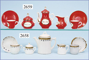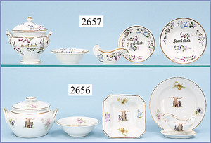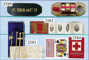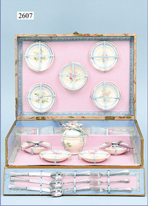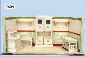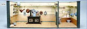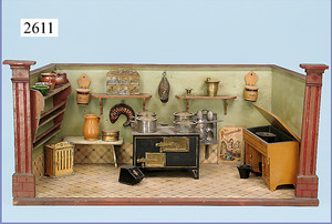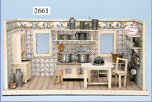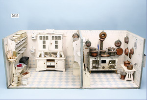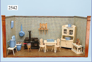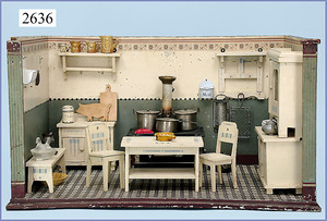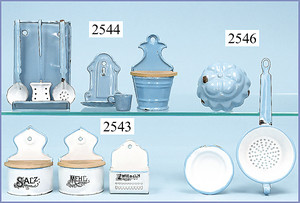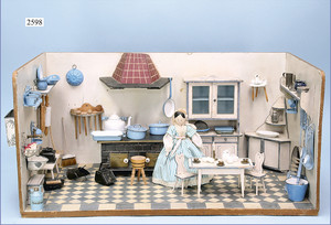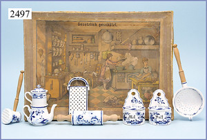 musealer Orig.-Kart., bunt lithogr., Küchenszene, ca. 1890, gefüllt mit Kinderset, Porzellan, blau/weiß, Zwiebelmuster, Nudelrolle, Salz -u. Mehlmetze, Reibe, E-Kocher, Siebe, Quirl-Klopfer, Löffel, Kannen, Länge Nudelrolle 20,5 cm, traumhafter Orig.-Zust. ( n. a. T. f. )