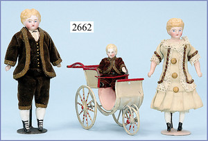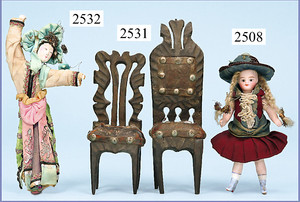 Biskuit-Porzellan-Mignonnette, 13 cm, Kurbelkopf, braune fest eingesetzte Glasaugen, bewegl. Arme u. Beine, 1 Bein ergänzt, dazu kl. Puppenstuben-Puppe, 13,5 cm, Biskuitkurbel-Kopf, blaue Schlafaugen, off. Mund, Masse-Stehkörper, alte Kleidung