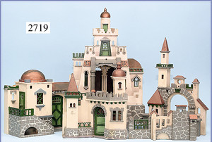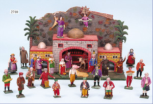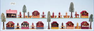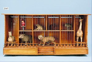 ERZGEBIRGE Vogelgarten, Figuren 5 cm, Gebäude, Luffabäume, Vögel naturgetreu gearbeitet, mit aufgeklebten Federn, Orig.-Holzkiste, mit lithogr. Deckbild, Figuren fein ausmodelliert, mit angedeuteten Nasen, museal ( n. a. T. f. )