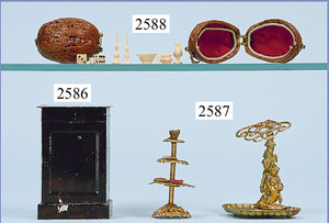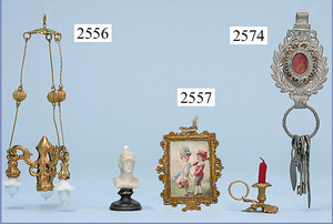 Vogelkäfig, Messingblech vergoldet, mit kl. Wachsvogel, 6,5 cm hoch, 1 Wandkorb, Messingblech vergoldet, 4,5 cm breit
