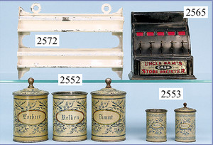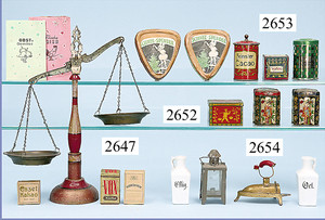 Konv. Kaufladenteile, Dosen, Blech lithogr., 1 Dose Papier beklebt, 3 Glasflaschen, 2 Bilderbuch-Heftchen, Kinderbibliothek Nr. 18 u. 17
