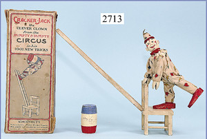Karnevalsfigur, Polichinelle 14 cm, Biskuitbrustblatt-Kopf, Arme u. Beine, Stoffkörper, ausgef. Seidenkleidung mit Goldrand u. Spitze für Karnevals-Szene in einer Puppenstube o. Puppenstuben-Theater