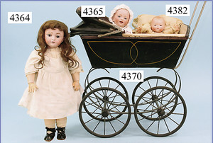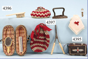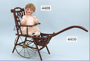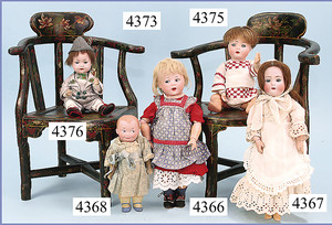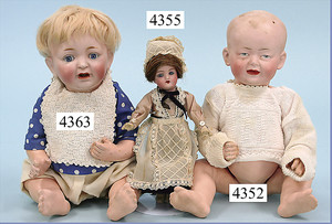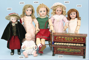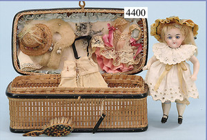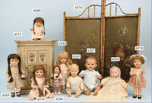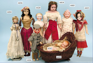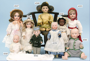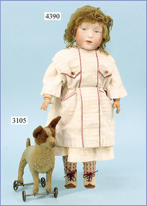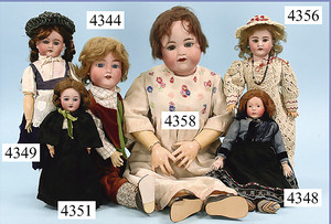 K & R 109, Biskuitporzellan-Charakterpuppe, 54 cm, Kurbelkopf, blaue gemalte Augen, leicht off./geschl. Mund, Gliederkörper, alte Kleidung, alte Schuhe, alte Mohairperücke, einige Ofenstaub-Einschlüsse im Gesicht, 2 kl. Brandrisse am Wulst der Kopfkrone, 1 Brandriss vorne, ca. 1 cm in den Kopf hineingehend