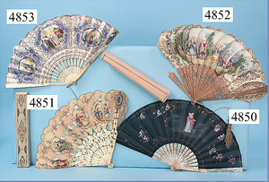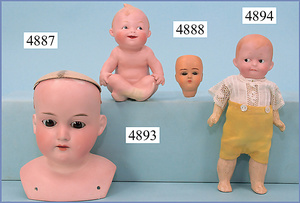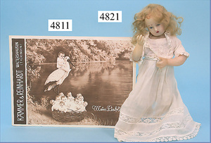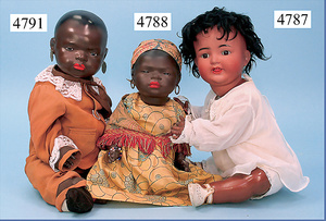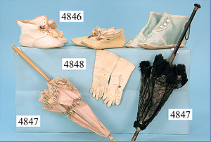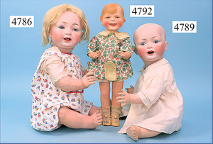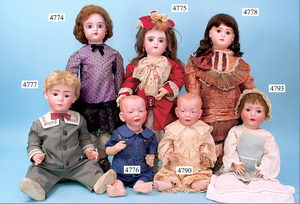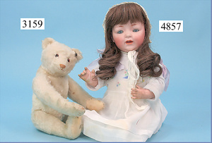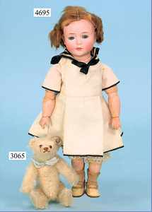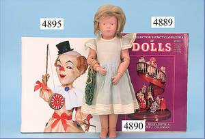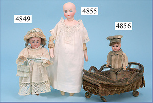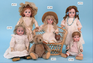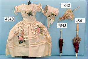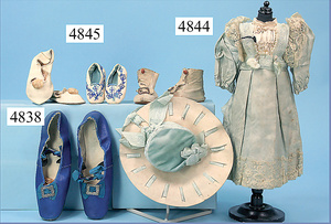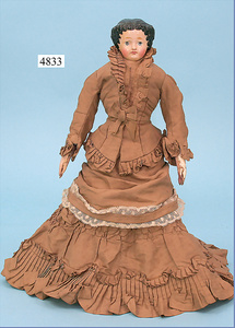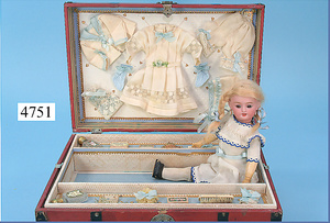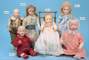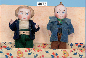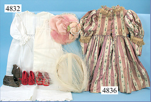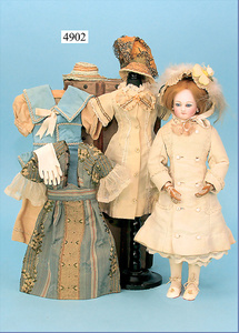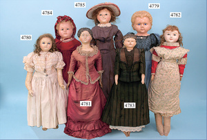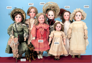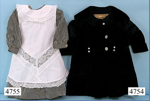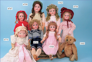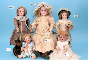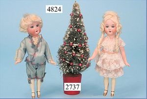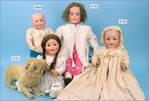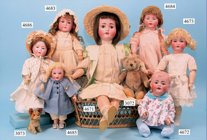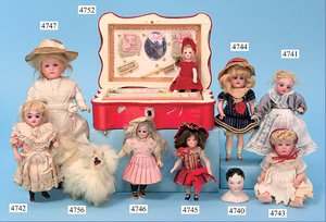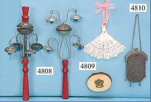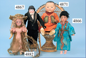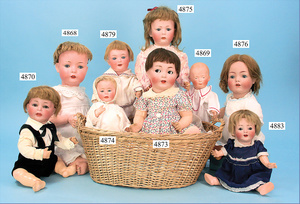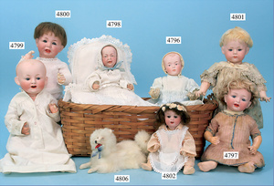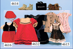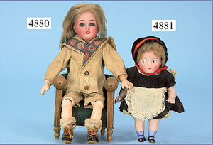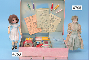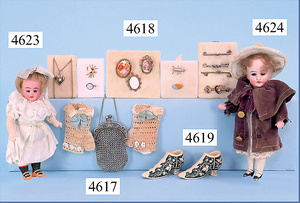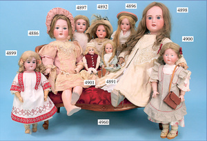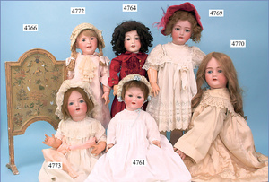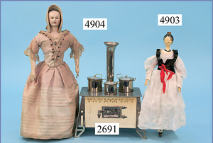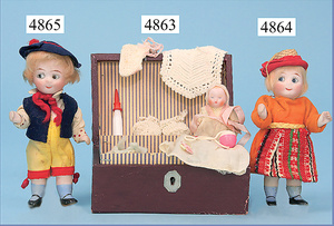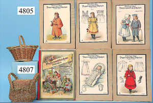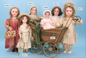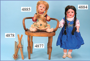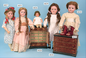 9 Teile Puppen-Deko, Schlafzimmerschrank, 1927, mit Jugendstil-Ornamenten, aufgemaltes Furnier, 38 cm hoch, Bett 43 cm lang, 1 Nachtschrank, aufgemaltes Furnier, Messingverzierungen, Frisiertisch mit Kippspiegel, 20,5 cm breit, Schublade, 2 Schränke, Spiegelglas fehlt u. Sitzgruppe bestehend aus 2 Stühlen, Bank, Tisch, 25 cm breit, aufklappbar, aufgemaltes Furnier, Messingbeschläge, Garderobe, guter Zust., 1 Tür liegt lose bei, ca. 1925, schöne Puppen-Deko
