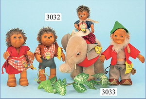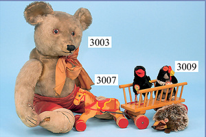 STEIFF 3 parts, 1x Maxi, No. 4312.00, 1 hedgehog, button, chest label and cloth tag label are missing, 1 Huki, No. 4120-10