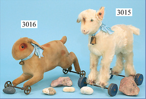 STEIFF pull game, sheep, c. 1910, 24 cm, casting wheels with spokes, with button, shoe button eyes, felt at the snout is a little bit damaged, slight pelt loss at back, otherwise good condition