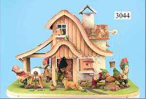 STEIFF machine, the dwarf farm, 7 dwarfes 6 of it in motion, 1 at chopping block, 1 at whet-stone, 1 is opening and closing the window, 2 at a saw and 1 at cable, electric drive is intact, rubber parts with formations of cracks, around 1950