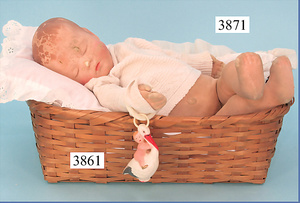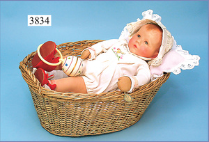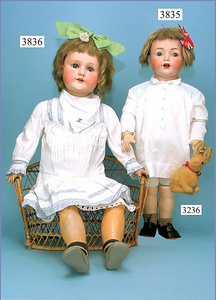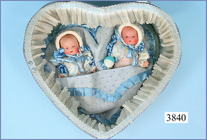 AM pair of twins, 351/9/0K, 14 cm, blue sleepy eyes, open mouth, lower teeth, baby with sitting body, embed in a cushion, heart-shaped and original box, wicker