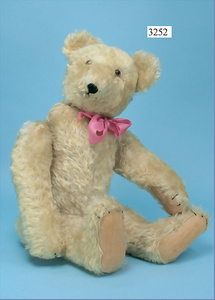 teddy, 67 cm, white mohair, with straw stuffed, mohair at a leg is slightly teared, otherwise mohair except of small places good, good felt parts, arms were loosely sewn on, very expressive