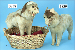 skin dog, with waggle head, glass eyes, mass snout, jaw is broken in the middle, clock mechanism wasn't checked, 54 cm long, feet in front were knocked, otherwise good, c. 1910, nice doll decoration
