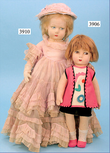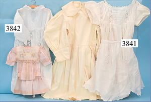 2 parts doll dresses, c. 1910, pink colored dress for a doll that is c. 32 cm tall, 1 dress white, c. 50 cm doll