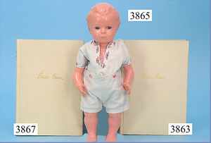 SCHILDKRÖT Hans, 49 cm, bright celluloid, socket head, fix inset blue glass eyes, light colored modelled hair, without damage, original box, with sign, clothes from the age