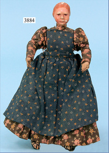 KÄTHE KRUSE mannequin, adult woman, closed mouth, with smiling face, original painting, at 1 side with lashes, down below at neck with flaked of magnesite parts, and at the side of a cheek, nose with small worned places, body with joint functions in the arms, legs and hip, waisted, with add breasts, old clothes, the adult dolls from KÄTHE KRUSE are very rare