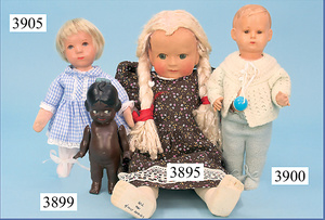 Puppe Nr. 1H, Stoffkopf, 3 Hinterkopfnähte, breite Hüfte, separat angenähter Daumen, kl. Abriebstellen im Gesicht, Körper stark bespielt, mit einigen Fehlern u. alten Reparaturstellen, an der Schläfe sowie am Ohr geringfügig farblich ausgebessert