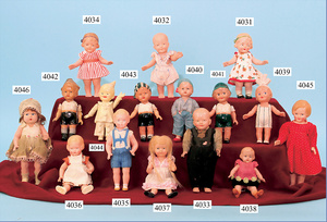 SCHILDKRÖT 3 parts celluloid, baby in a cushion, 7.5 cm, 1 baby 14 cm, doll with stiff legs, 1 baby with sitting body 10 cm, very good condition
