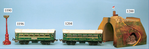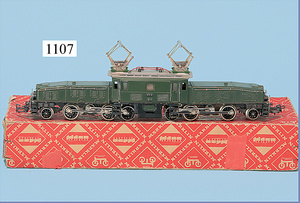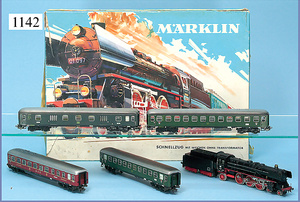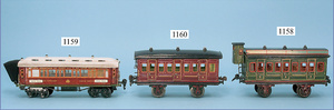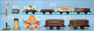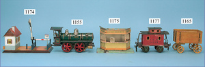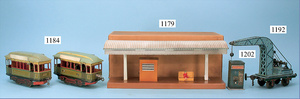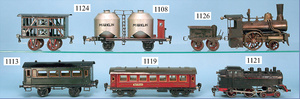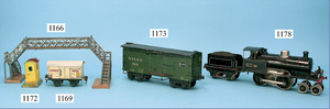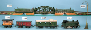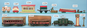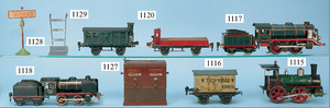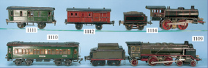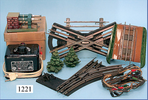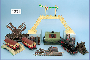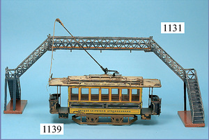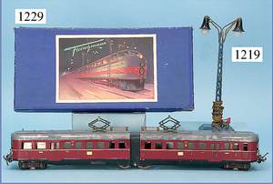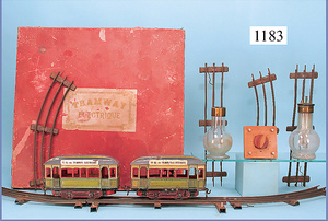 BING GBN, track I, electrical tram, Tramway Electrique, for the French market, lithographed tin, rare French label, used, with small scratches on the paintwork that are caused of old age, railcar and trailer always 21 cm, pantograph is missing, in original wood box, with imprint, track material, control, 2 bulbs, one of it isn't complete, the other wasn't technical checked, nice unused original condition