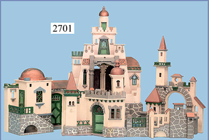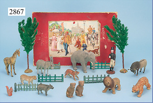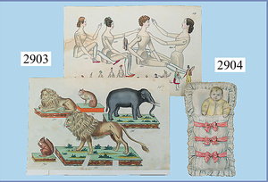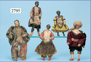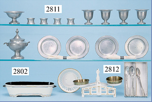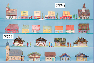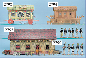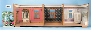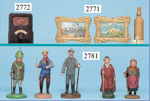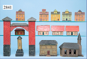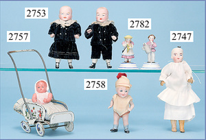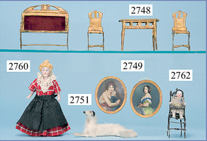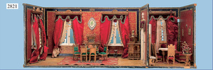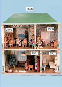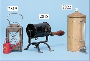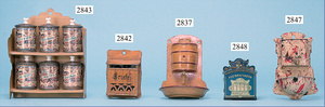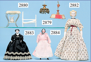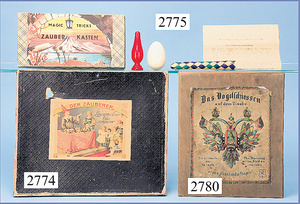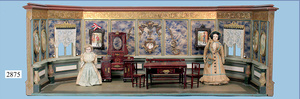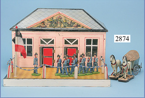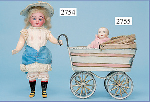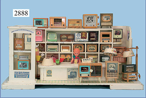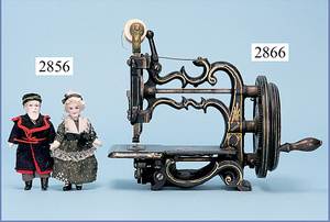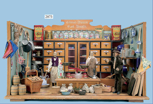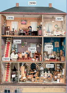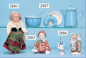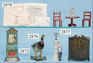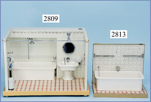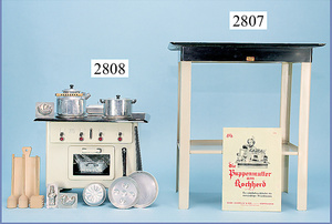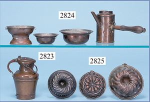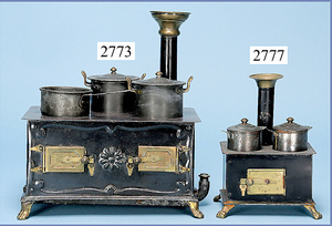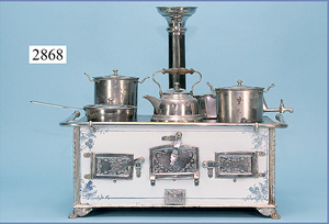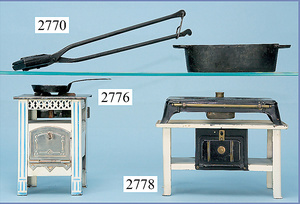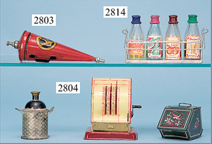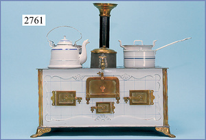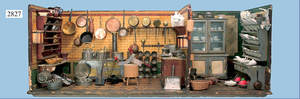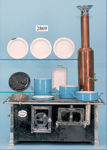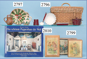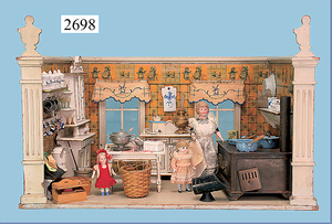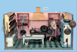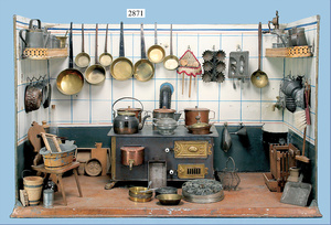 doll kitchen, tin, 75 cm wide, 51 cm tall, 46 cm deep, with fix fitted shelves at the side, corner washbasin with tap, with lying water tanks in the back, very nice original painting at wall and bottom, with some paint defects that are caused of old age, richly equiped, tin, copper, brass, wood, and tinplate parts, glass at the butter machine isn't original, dollkitchen stove with water vessel inside, early, some pots aren't suitable, c. 85 accessories, c. 1890, is a museum piece