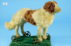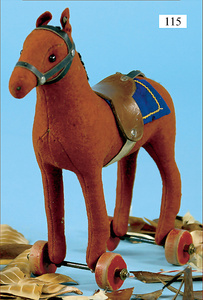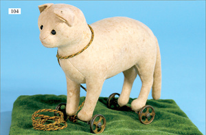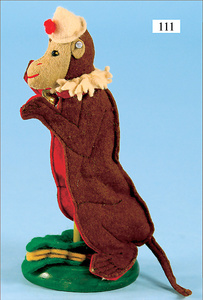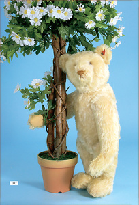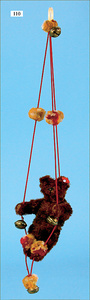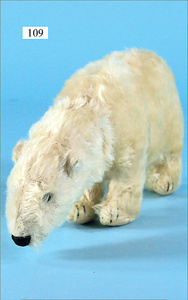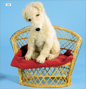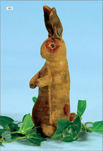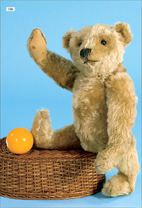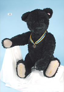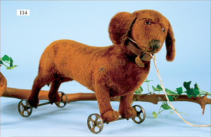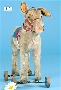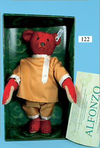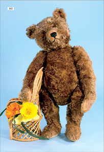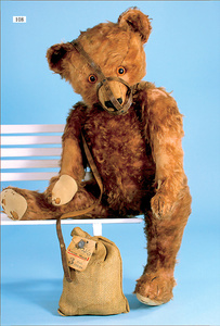 STEIFF, Der Brummige, Teddybär mit Maulkorb, ein Bär mit Geschichte, dunkelbraun, Brummstimme, Artikel-Nr. 5350,27, hergestellt von 1911- 1917, 70 cm, mit Knopf, Ledermaulkorb, STEIFF gestempelt, dieser Teddybär wurde als Dachbodenfund im Raum Berlin entdeckt, an den Fehllstellen des Mohairs erkennt man wie stark er von seinen ehemaligen Besitzern geliebt wurde, jedoch verbarg er noch einen Schatz in sich, auffällig war sein schweres Gewicht, da die Füllung etwas zusammen gefallen war, sollte der Bär neu gestopft werden, bei der Reparatur wurde ein Münzschatz in einem verplombten Jutesäckchen der preußischen Münzstätte Berlin, mit einem Inhalt von 500 3,00 Markstücken 1922 (Weimarer Republik) in Mengenwert von Mark 1.500,00 gefunden. Das Jutesäckchen ist unversehrt u. verplombt u. trägt einen Papieranhänger mit interessanter Beschriftung, der Sammlerwert der Münzen beträgt ca. EURO 3.000,00, ein außergewöhnliches Stück mit einer besonderen Geschichte