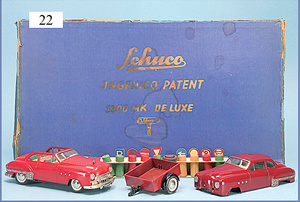 SCHUCO, 3000, Blech, 10,5 cm, Gangschaltung, Uhrwerk intakt, mit Zubehör, Lenkrad für Fernbedienung, Holzklötze, Schlüssel, Kabel fehlt, im Orig.-Kart., kl. Druckstelle am Dach, sonst guter - sehr guter Zust.