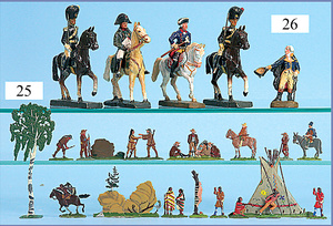 ausgef. Zinndarstellung, Der Schatz im Silbersee, Karl May Figuren, flach, 3 cm, Indianer, Trapper, Zelt, Baum u. Geländeteile, Orig.-Kart., wohl weitgehend kompl., auf Vollständigkeit nicht geprüft, ca. 40 Figuren